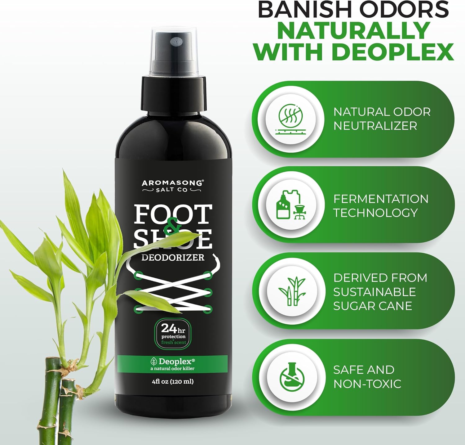 Aromasong Shoe Spray with natural Deoplex and tea tree oil eliminates odors, provides antibacterial protection, and keeps shoes fresh for up to 24 hours.
