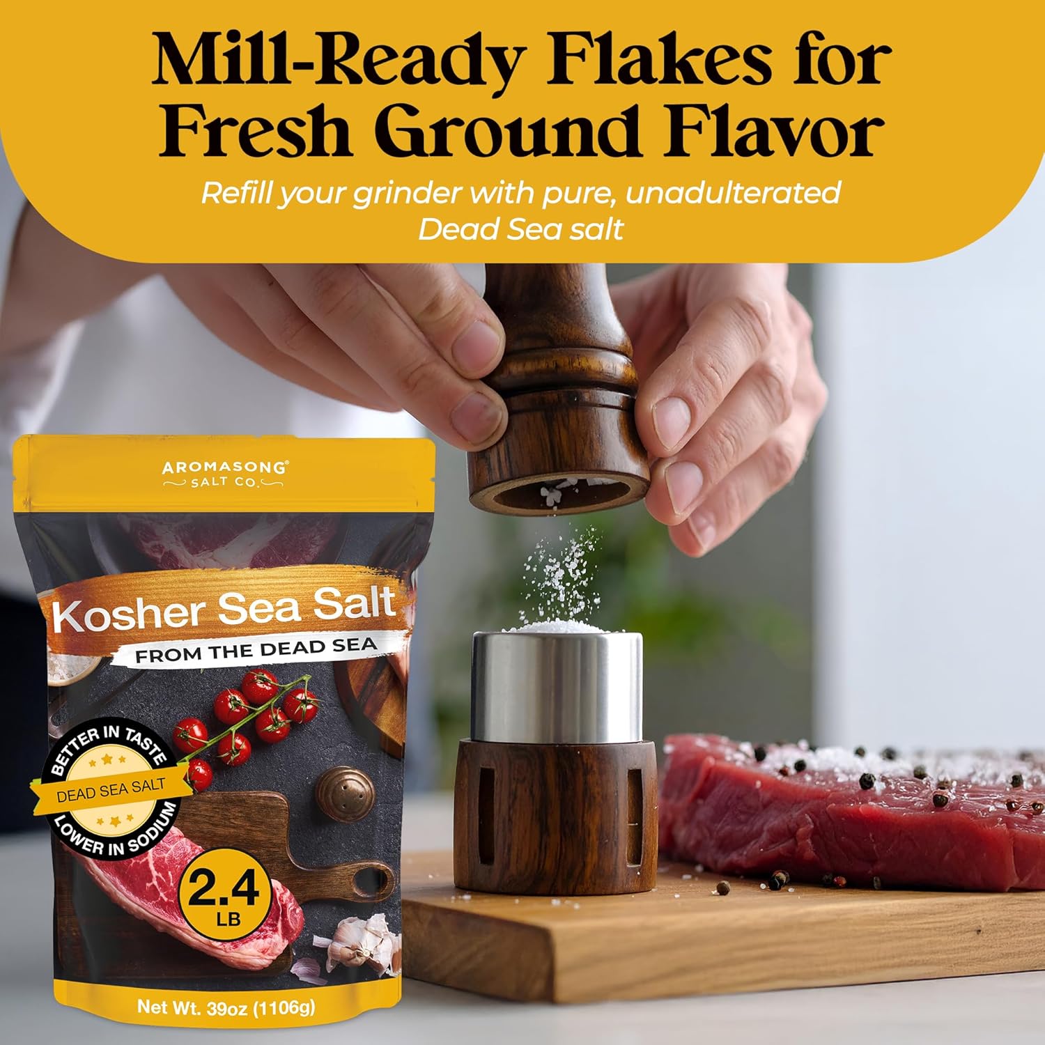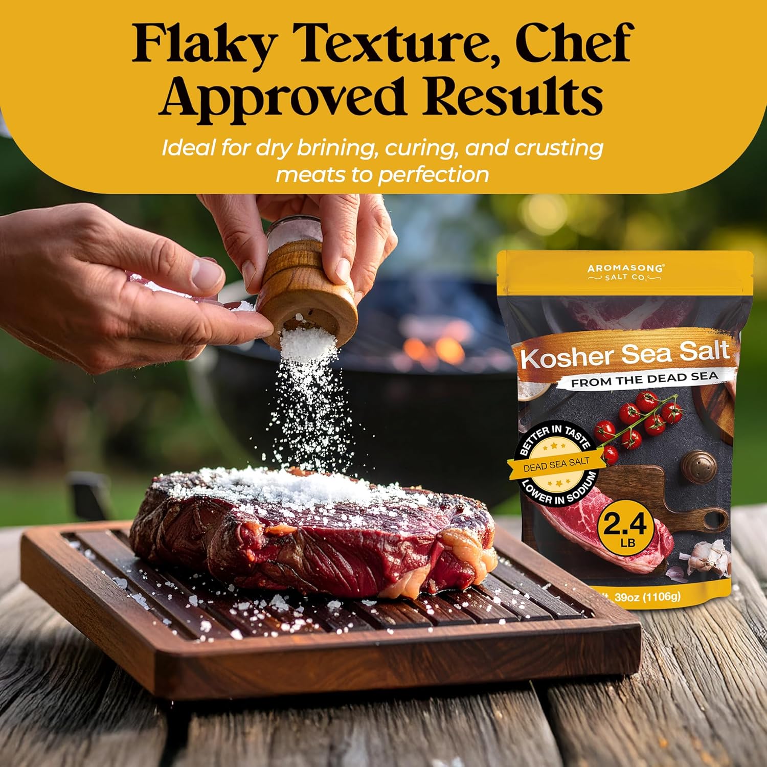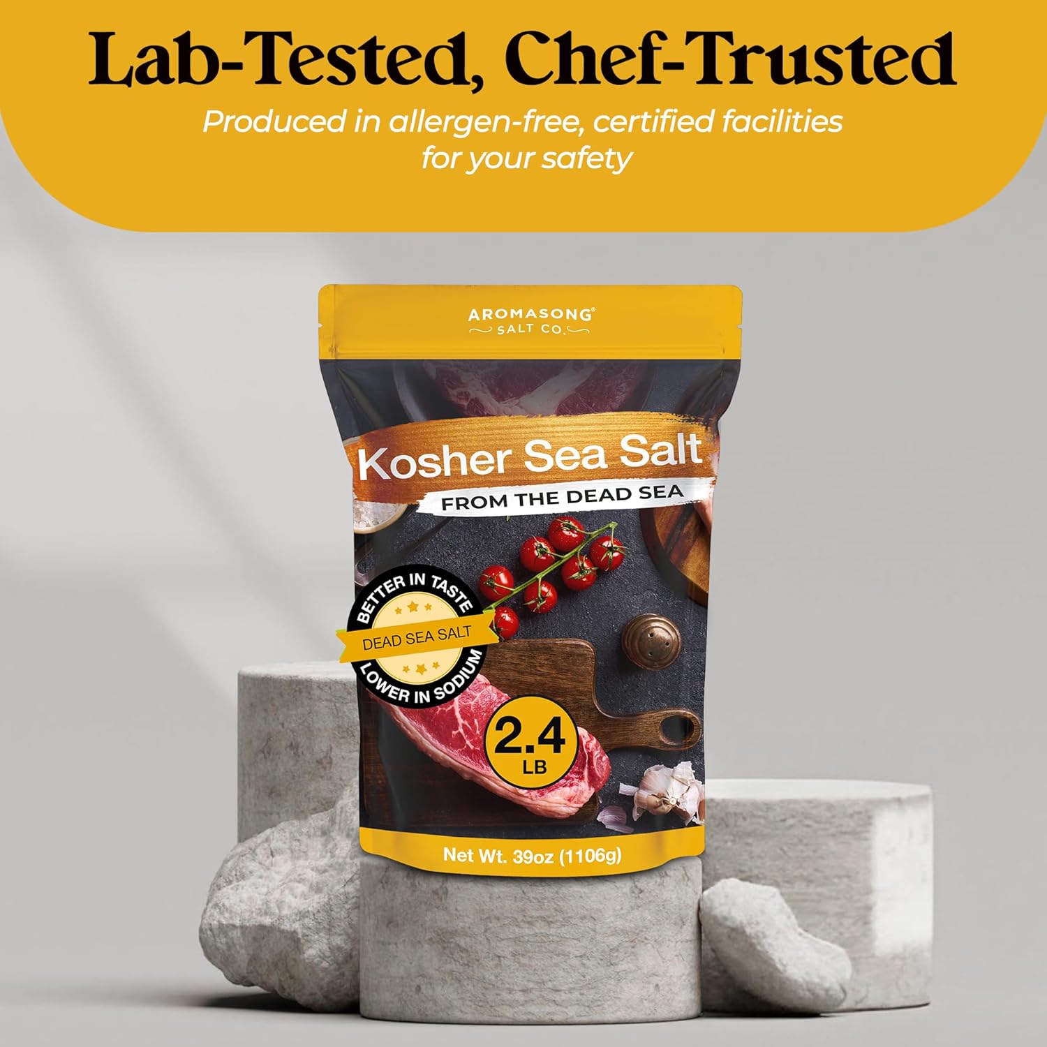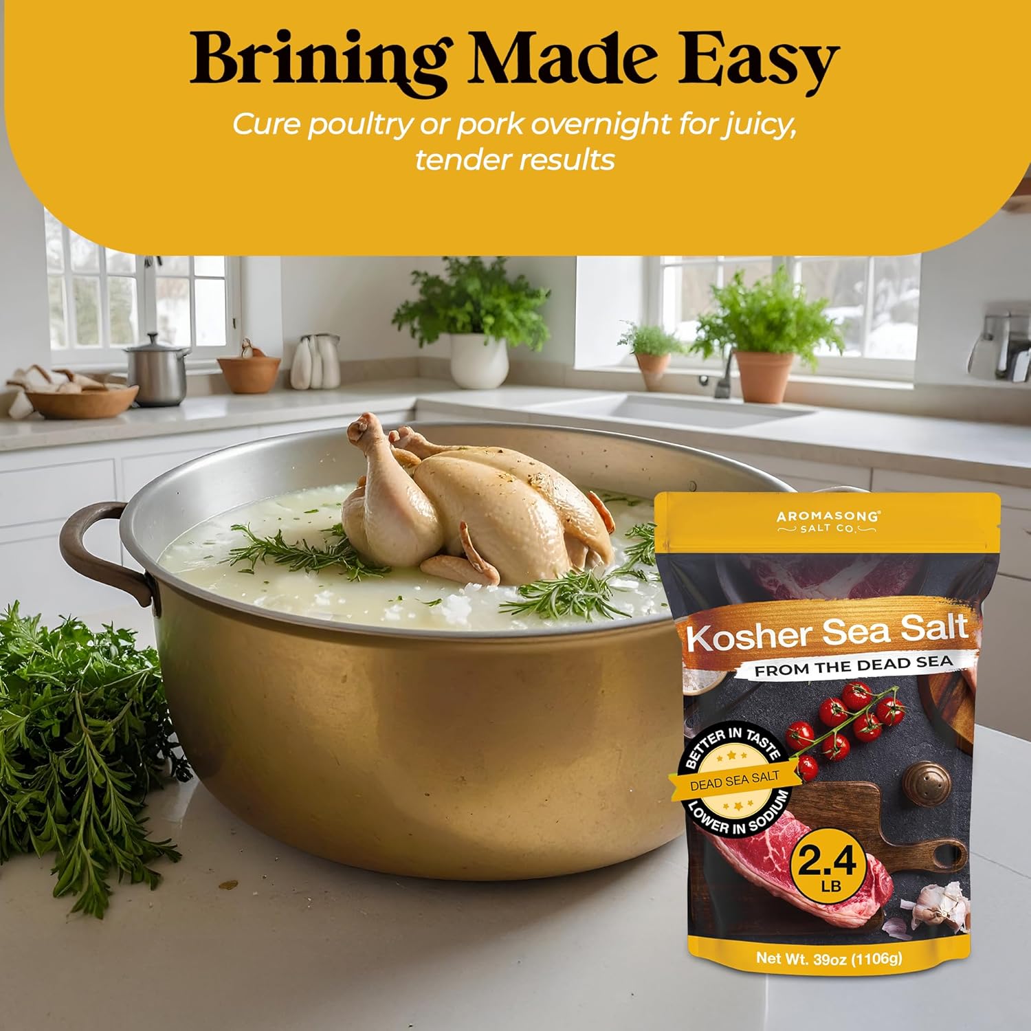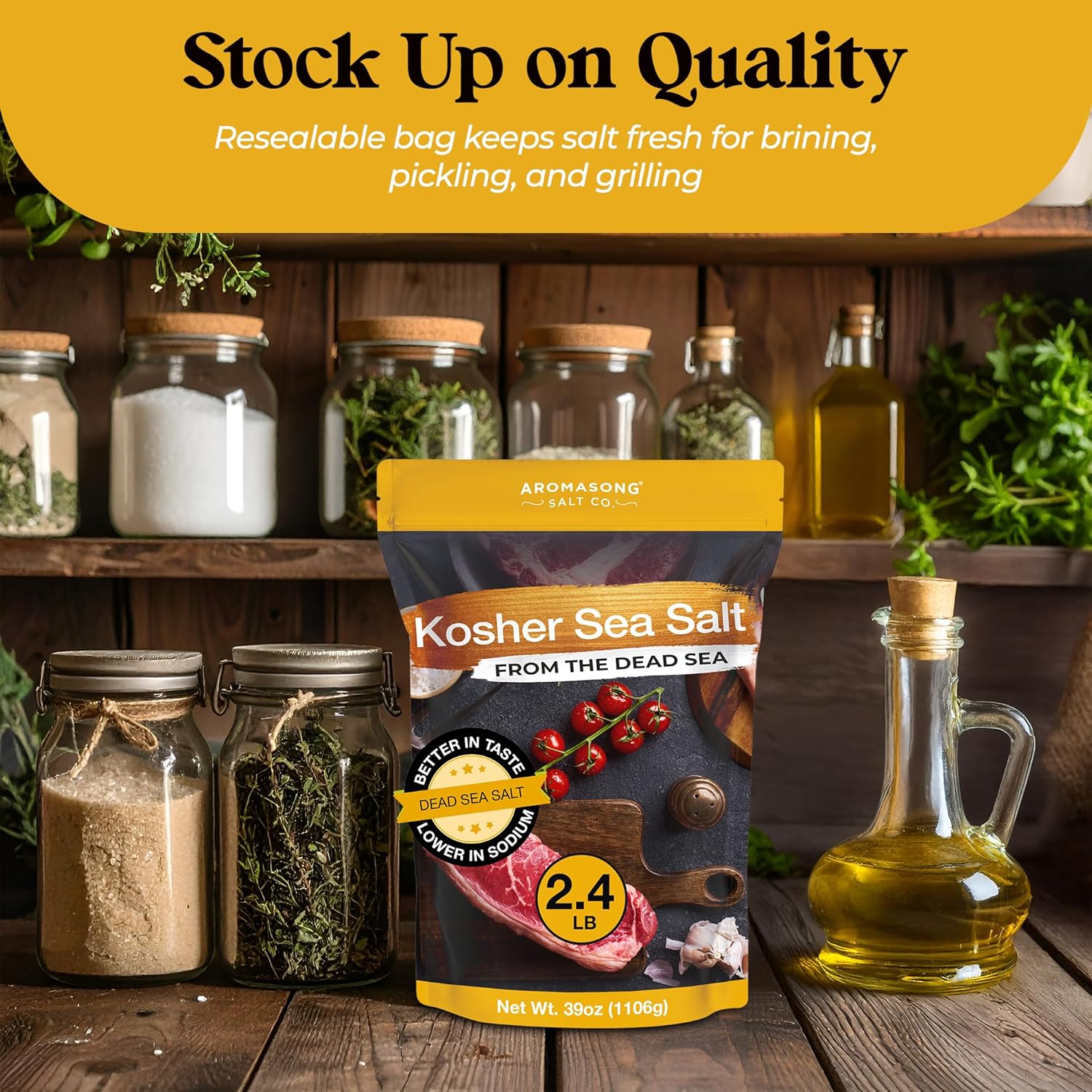 Aromasong's 100% Natural Kosher Salt is unrefined, free from additives, and perfect for seasoning & brining, Its coarse grain texture ensures easy handling, and it comes in a 2.43 lb resealable bag for freshness and convenience.